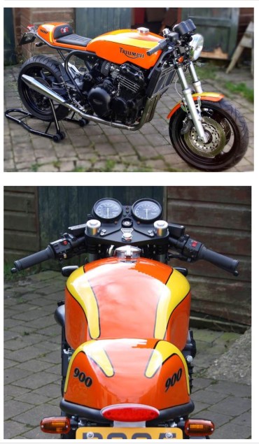 X-75 Redux – Here’s a good looking beast: a nineties 900 triple revisioned in the punchy orange and yellow color scheme used by Craig Vetter on the mud seventies 750 Trident.
