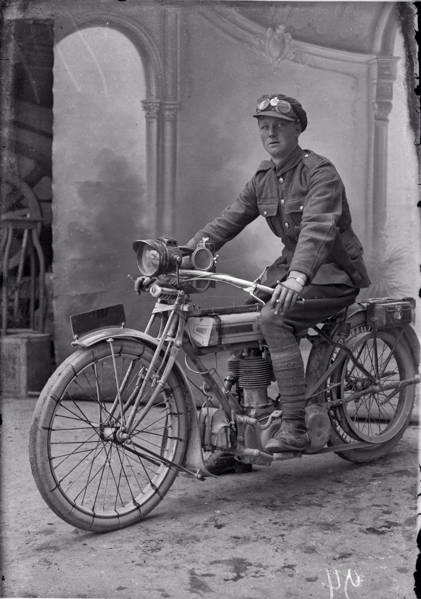 Century – A private of the Royal Engineers on his motorcycle. The chevrons on his lower right sleeve show he is in his third year of overseas service… One Hundred years ago today saw the start of a British offensive at Arras which, by its end a little over a month later saw close to 400,000 losses and casualties on both sides. The motorcycle is a wartime stalwart Triumph Model H.