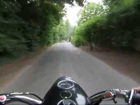 Vanishing Point – as the parallel lines of the road converge ahead, the shadow of trees above open up to an advancing bright spot in the country lane. The enclosing headlight nacelle of a Triumph Cubs controls pulls you along.