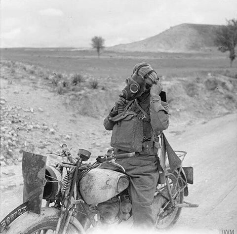 Whit a Gas! – Dusty trail across a rocky Mediterranean isle. An Indian Sikh despatch rider putting on his gas mask during a 50-mile motorcycle trial in Cyprus, 3 March 1942. A well worn BSA M20. The