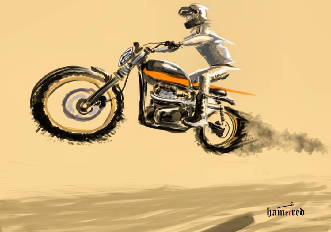 Air – like some Japanese watercolor from the Edo Period 江戸時代 this airborne Triumph soars across the tinted page in a blurry motion. Touched by the glisten of a desert sun the lazily brushed lines offer the glimpse of the briefest of moments between the land and the sky. Superb artwork by HAMMeRED.