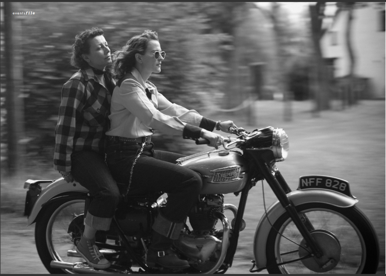Lasses on the Lanes – Hip shoe designer Lynsey Hand and her pillion pal zooming around on her 1959 Triumph T100. Photography by Nick Clements