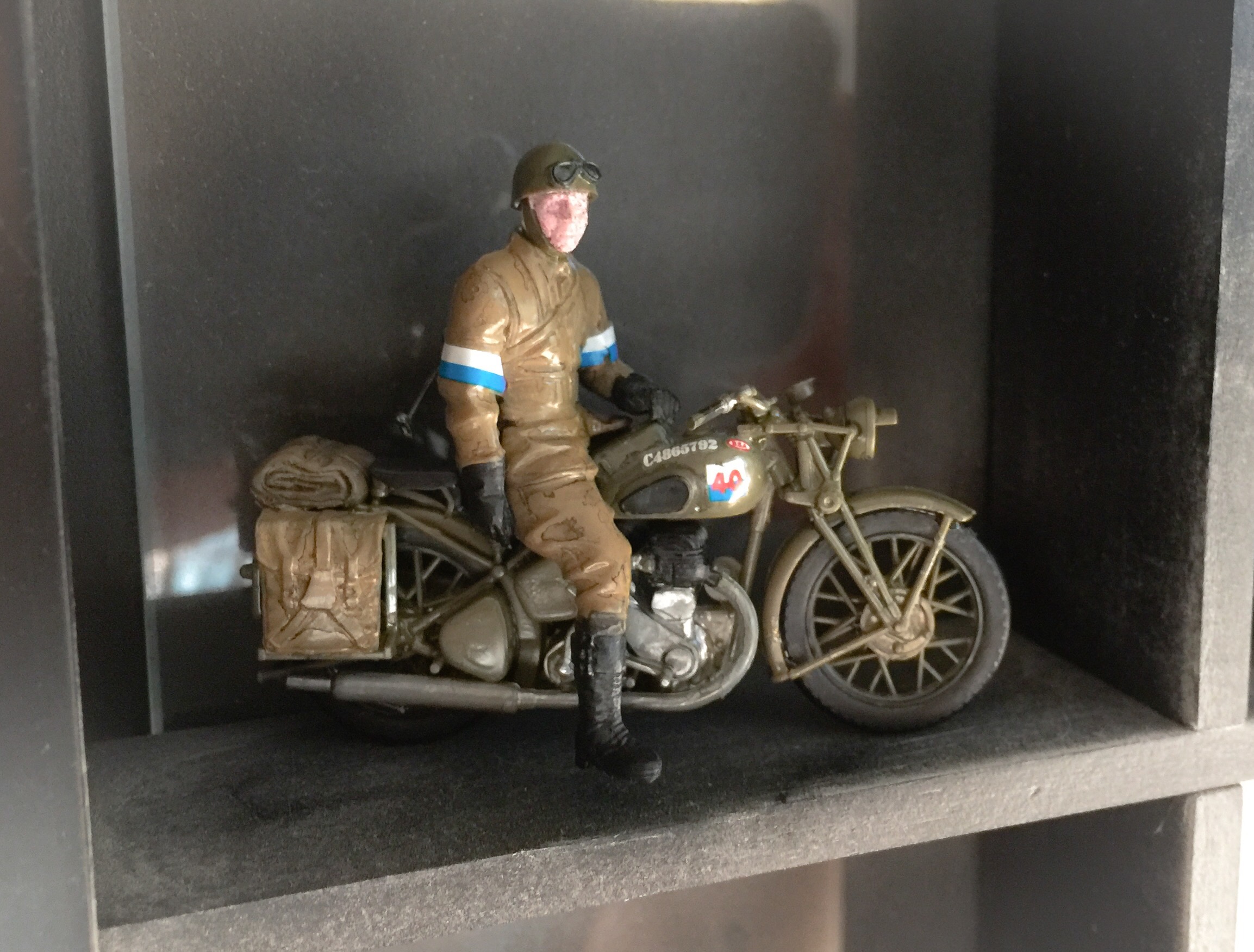 B.S.A. Scaled – just finished this little Tamiya BSA M20 model kit. First one I’ve built for thirty odd years. 1:35 scale with darned small waterslide transfers. I have the rider and bike in courier colors but this would have been the model my grandfather rode across North Africa during WW2. Next throwback hobby: balsa Spitfire!