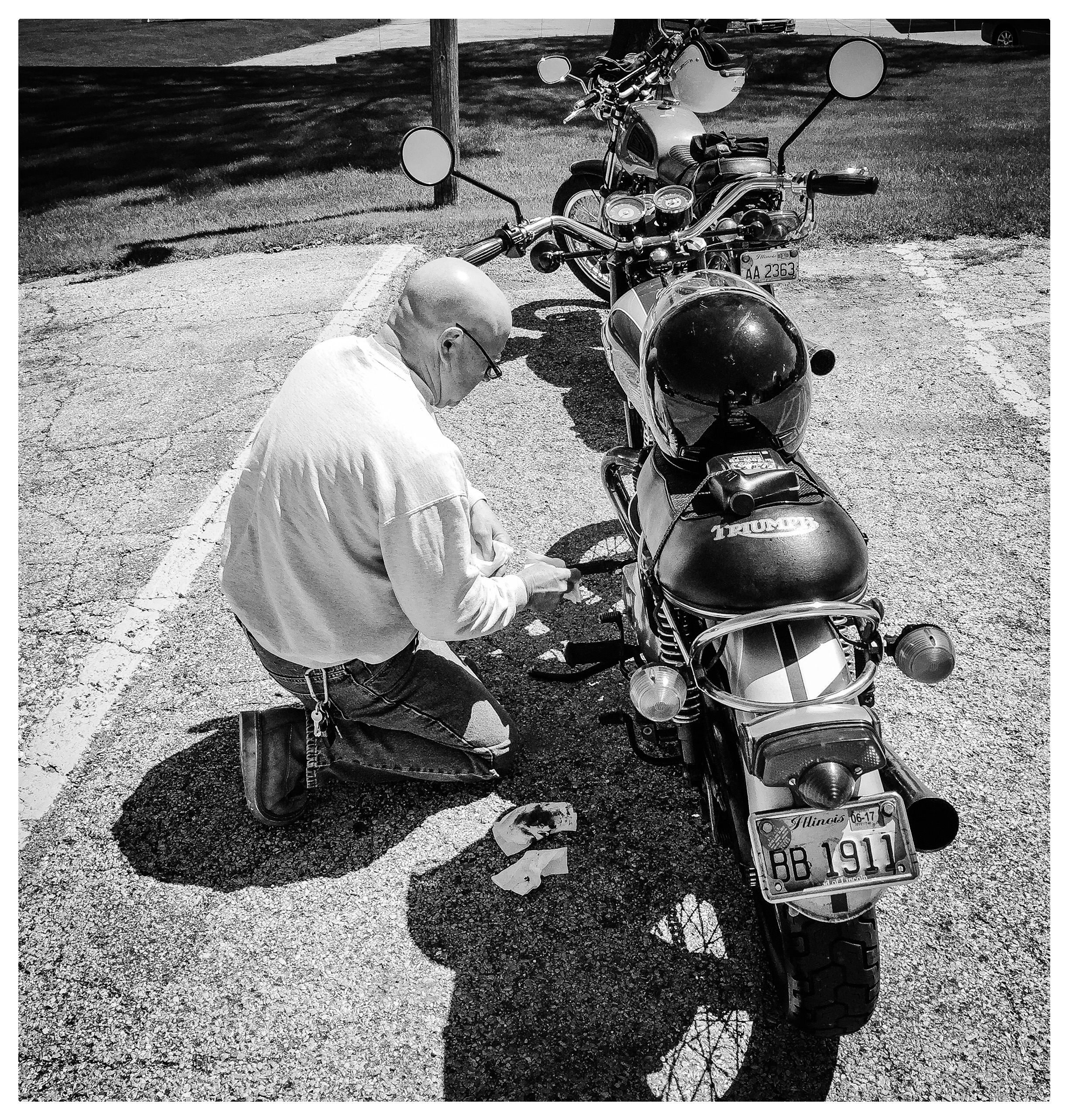 There’s a’wys summat! When your machine is reaching half a century in age even a 100 mile jaunt can uncover a mechanical snafu. Here Dean finds that the small timing pin plug behind the cylinders decided to jump ship somewhere between Glencoe and Antioch. Upsetting pressure and spewing a fine mist of oil onto the frame he had to get a 1/2″ bolt from a Napa auto parts store to make a temporary fix.
