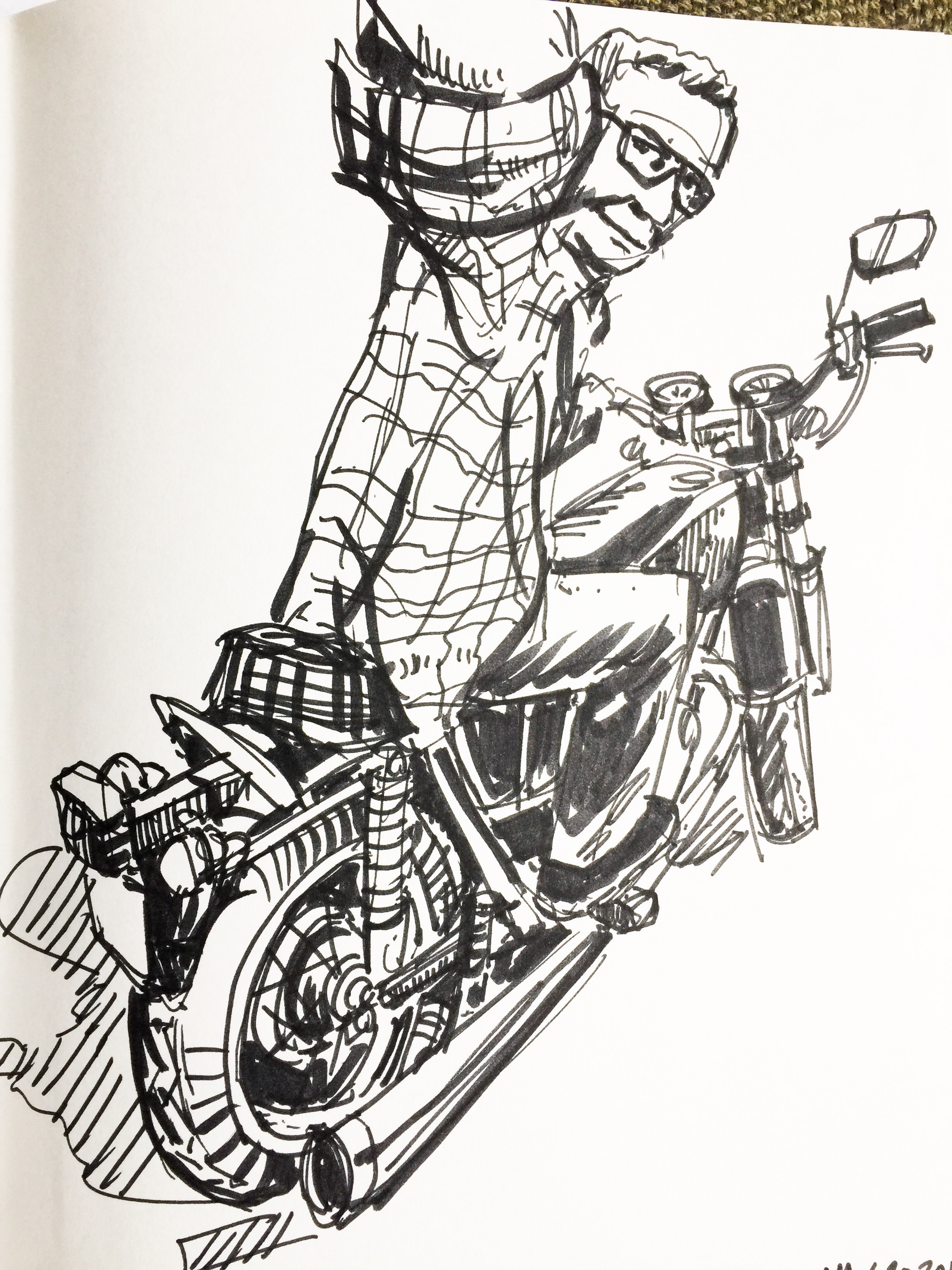 Selfie Sketch – trying out a new brush tipped drawing pen- here’s the first result. Based on a selfie view sitting astride the Bonnie. Not quite Jack Kirby but not bad for a 10 minute scribble.