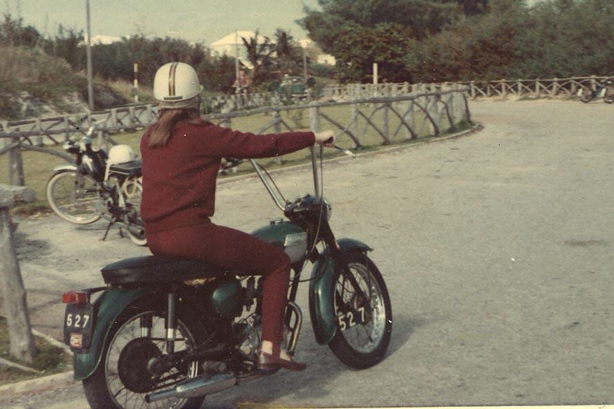 Aped Cub – Well; if you must. Forest green Tiger with hi-rise bars being hustled ’round some rustic park setting. Burgundy outfit, complete with stirrupped legs, add to the jolly nature of this period photograph. “Come in number five two seven, your time is up!”