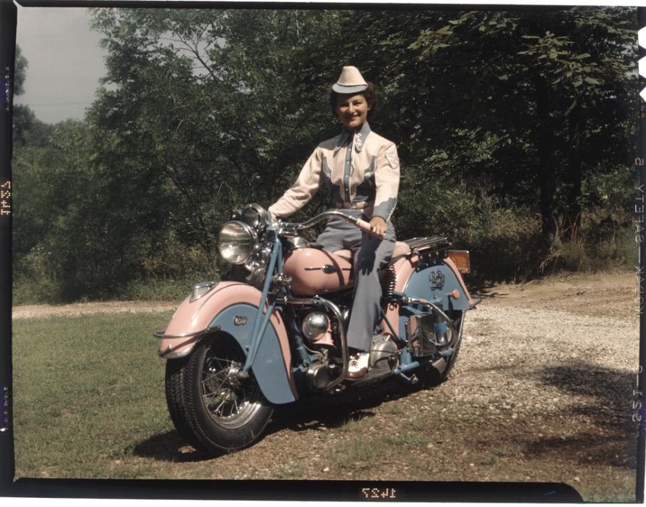 Pink Lady – Proud Helen Kiss Main on a her delightfully colorful Indian Scout. She was the first treasurer and one of the first 51 charter members of Motor Maids the oldest continually operated women’s motorcycling organization established in 1940.
