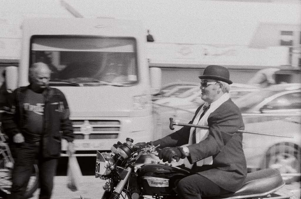 Bowler Hat & Cane – how else are you going to scoot about like a gentleman on your Bonneville. Silk scarf ready to fly like a pilots pearly white neck warmer. Smart rider gets appreciative nods from other bikers.