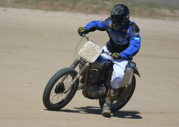 Flat Track – oval dirt aboard a stout tire’d Triumph Cub. Steel toe down on the inside bends and a death grip on the bars. Wrong the throttles neck and hold on!