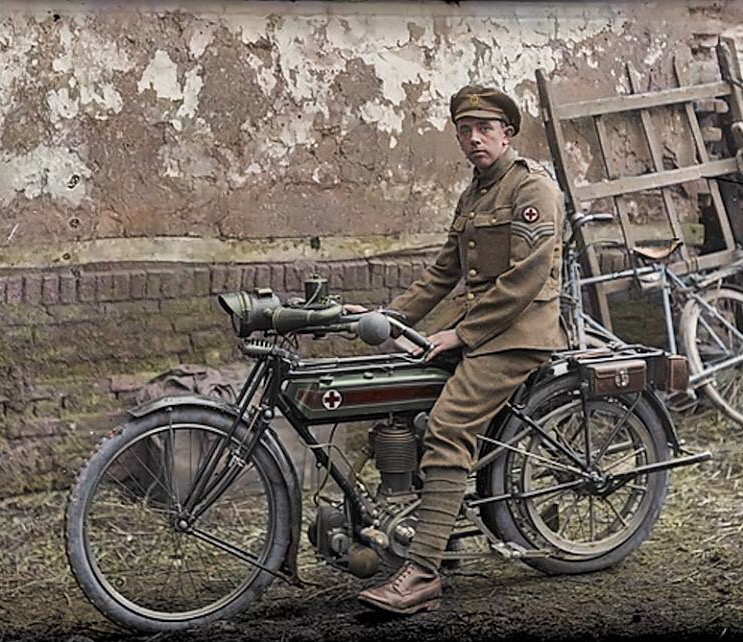 Red Cross – A serious young medical sargent on his 1917 Triumph. Agile enough to zip along behind the lines ensuring critical supplies get to where they were critically needed.
