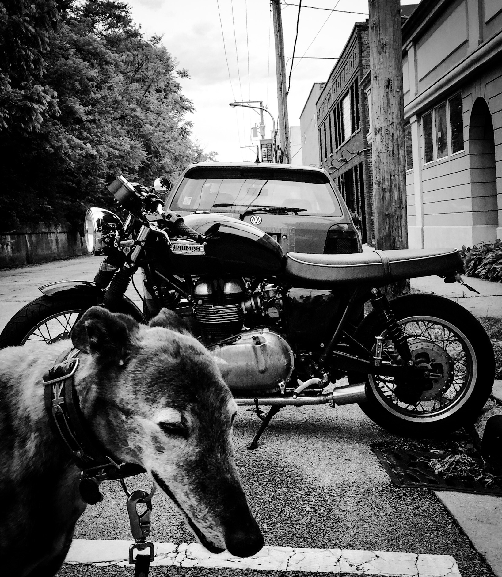 By a Nose – Geordie gives approval to a café’d Triumph on one of our walks.