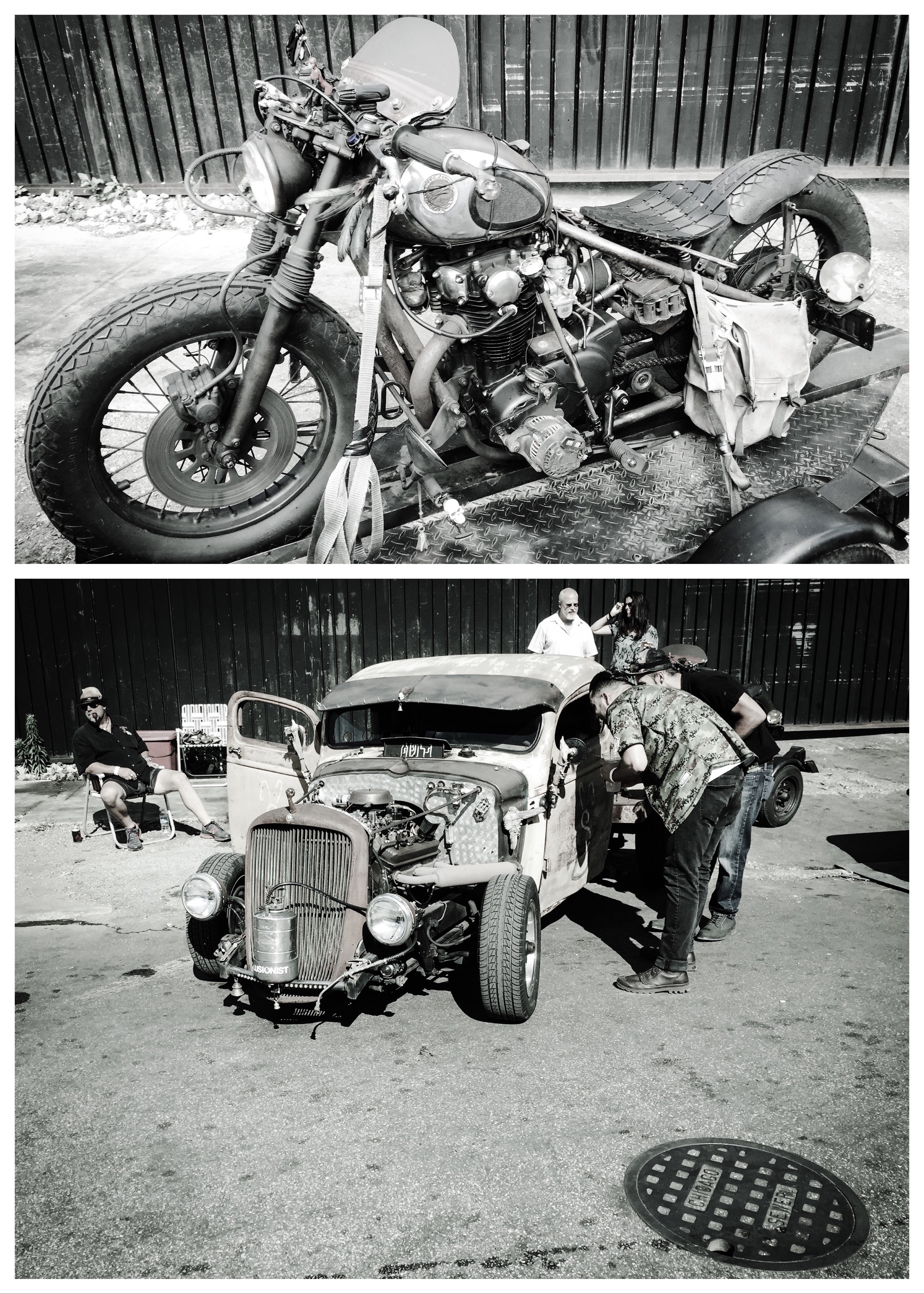 Brown Rat – the proud owner sits lazily by his conglomeration of odd and ends that create a unique truck and bike. Every item that added curious character was a found object. From the snap-on wrench door handle to repurposed tire tread rear fender. A 650 twin Yamaha was the donor Moto under its patina’d skin. #Motoblot #Ratbike