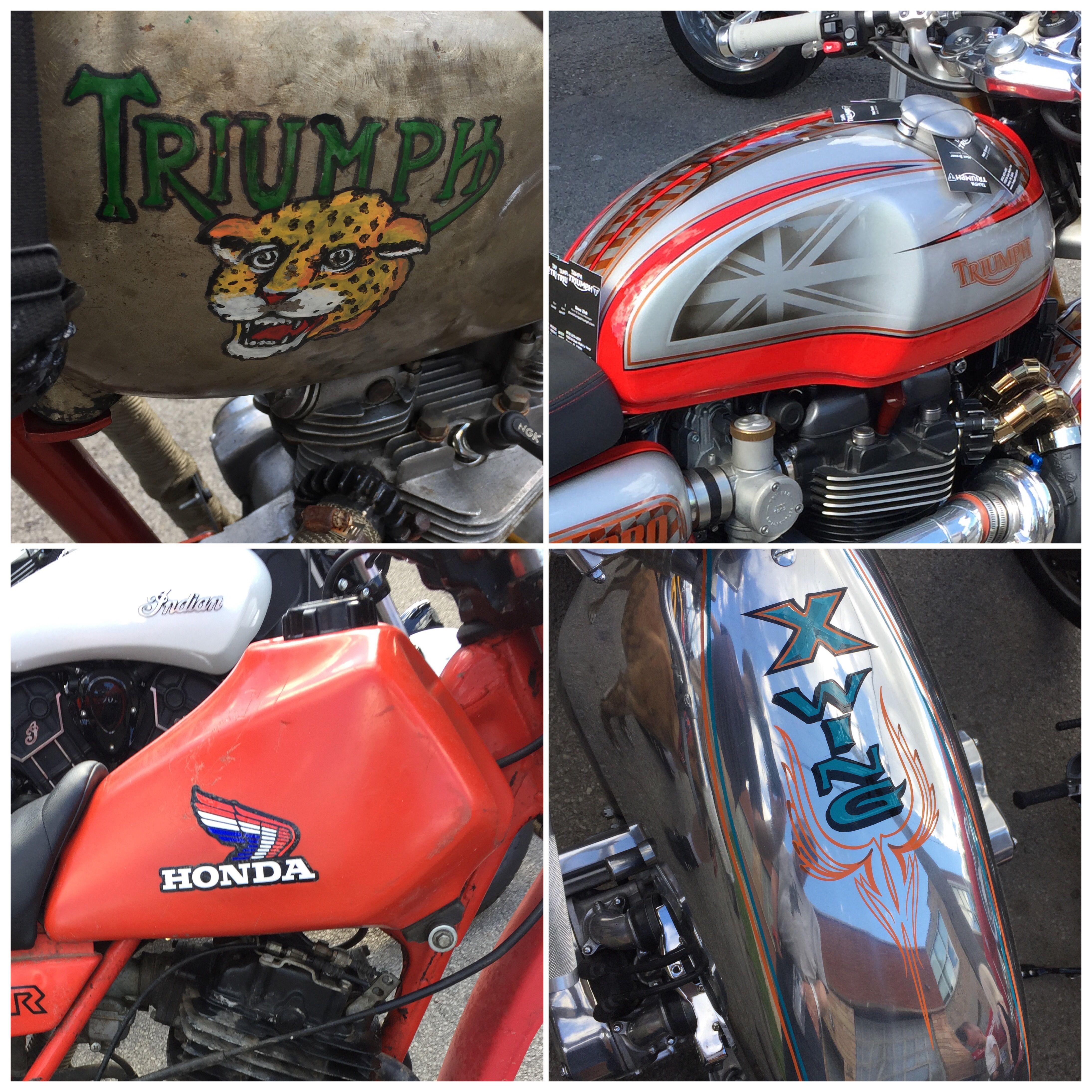 Personalization- gas tank art. From the hand painting of a smiling cat to the sign lettering on a polished cell. The beautifully air brushed custom tank to a decal applied on a dirt bike. The tank is typically the canvas for the owners mark. #Motoblot