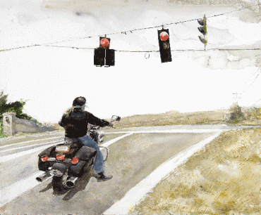 Stop – A single rider stands at an anonymous stop light in an off-color rural America. A grey sky holds the promise of rain yet the sun shines down on the motorcyclist. It’s one of Andrew Wyeth’s pieces from a decades long career of creating raw American art. It is stripped away and emotional imagery. We saw his home and studio last week in Brandywine PA. Today would have been his 100th birthday.