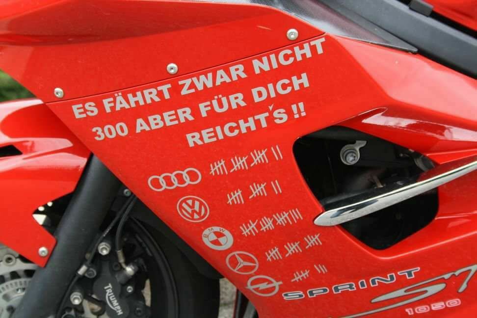 Autobahn Triumph – “It does not go 300 but for you is enough!!” This rocket-red Sprint 1050 is made for the hyperspeed roads of Germany – this bike’s owner see other deutchwagen as roadkill…