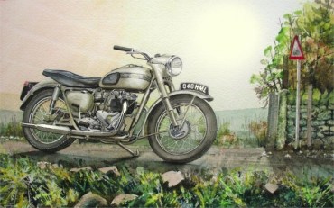 Common or Garden variety – we’re rained-in Longwood Garden Conservatory waiting for a fountain light show. So I’ll get on with a blog post. A gouache illustration with aged Triumph Thunderbird amongst verdant greenery. A moss covered dry stone wall and gloomy rain-fattened sky denote a very English scene.