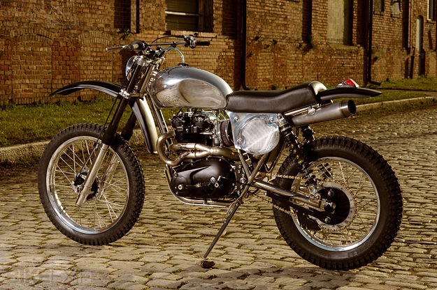 Long Legged Lout – another reincarnated Moto using a Triumph twin lump to power its knobbly tyres. Blacked-out engine shoehorned into a svelte twin/shock off-road frame. Wide bars steer the mile high forks whilst the rear springs allow any airborne antics to land with fair stability. I’m sure I can make room for one…