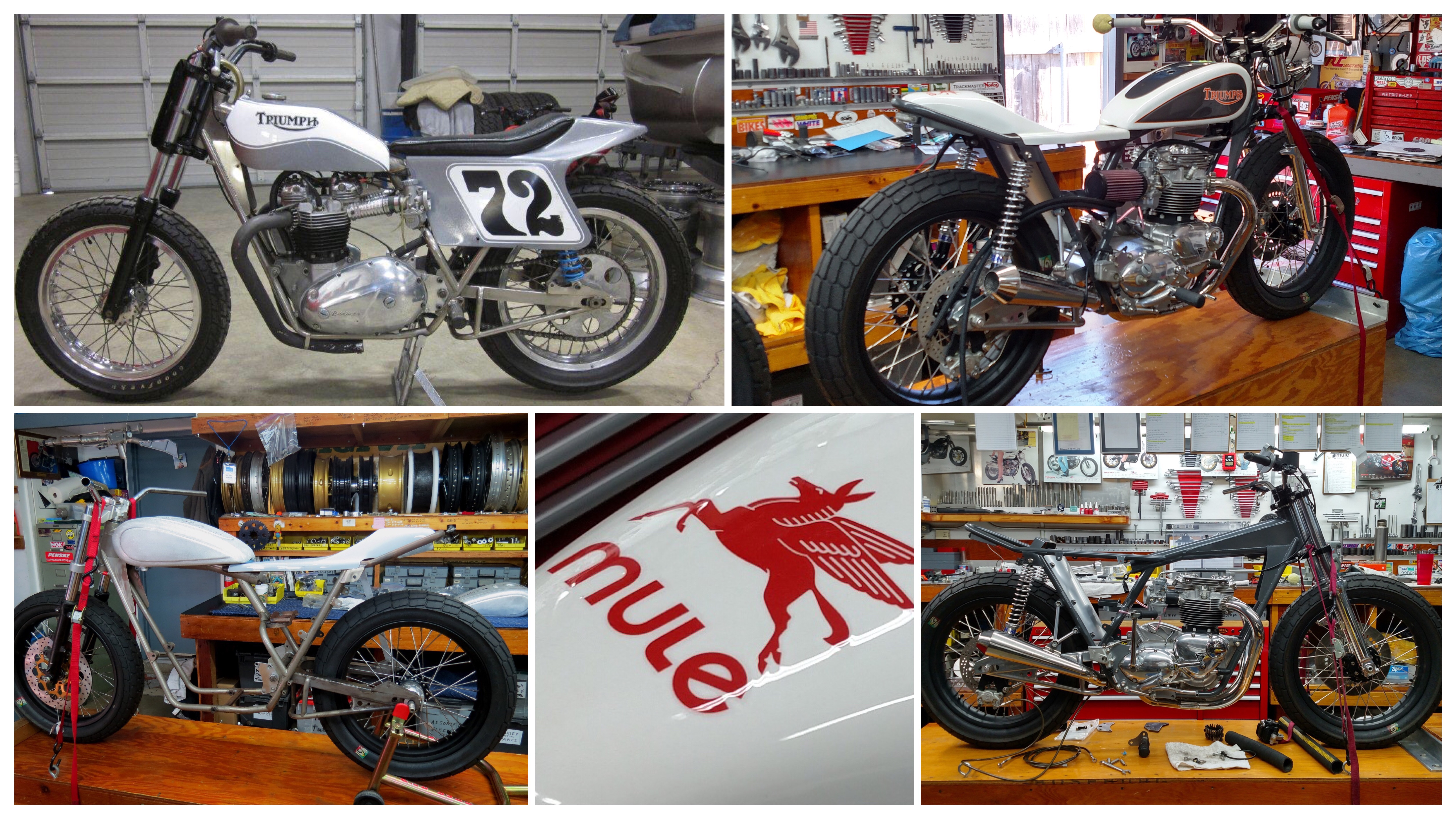 The Dog’s Pollocks – SoCal bike builder extraordinaire Richard Pollock Can conjure up a mean moto. He puts his able hands to many models but the tracker Triumphs are his most sublime offerings in my opinion. Tight geometry that will direct the riders control with immediacy; engines that have been fettled to a symphonic tune; and exotic frame elements, such as the 70’s Panther oil-in-frame & under-braced swingarm; all make for Mule badged machine.  A Pegasus Burro.