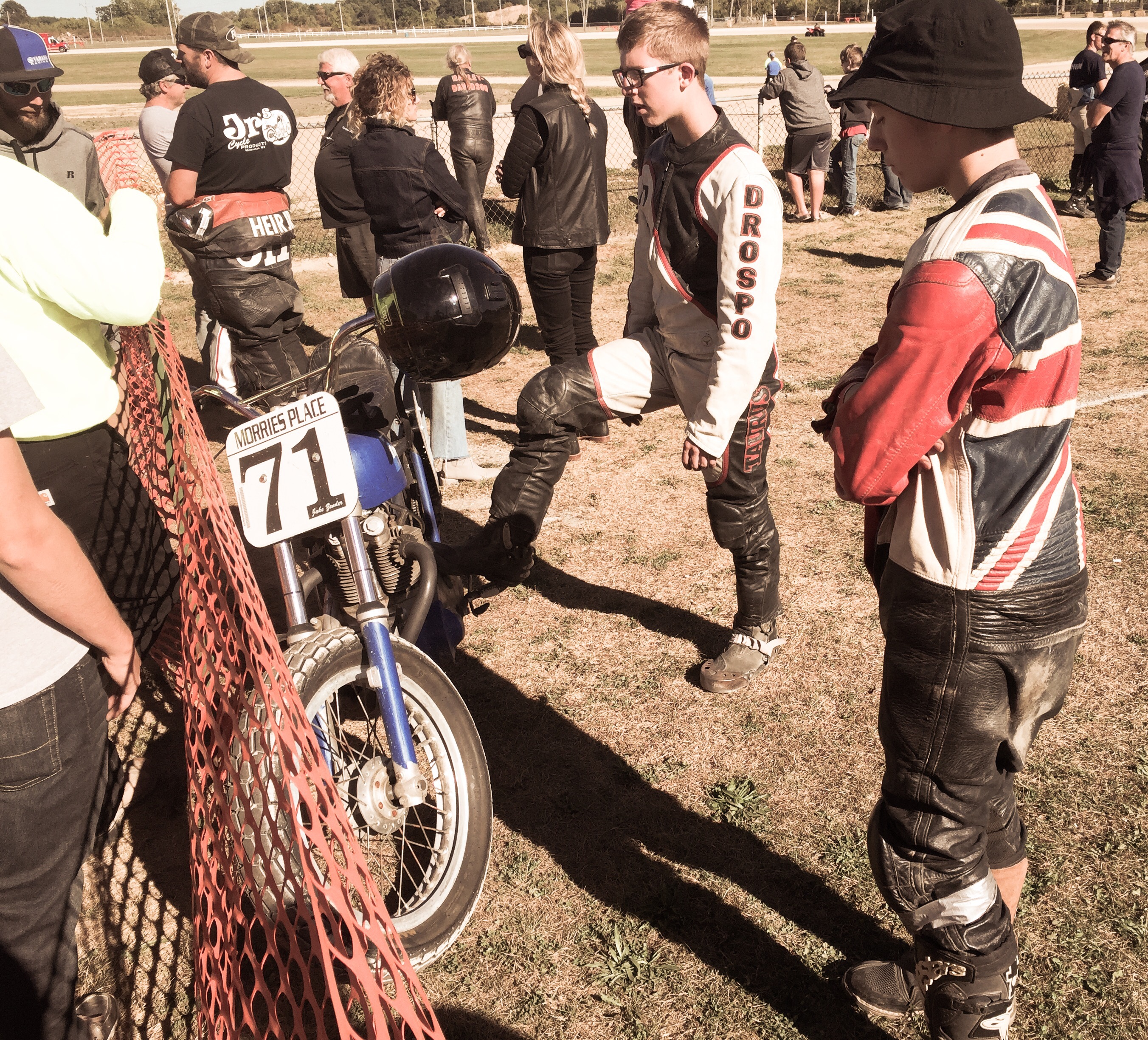 Half Mile – grand day out to the Walworth County Fairground located in Elkhorn Wisconsin to see the limestone track racing. Fast motorcycles of sixties iron to modern 2-stroke screamers were run to great effect. Here is Jake Zender, son of Morries Place owner Ed who raced this Triumph twin. Steel shoe scuffing around the gravelly track as knobbly tires throw up stone and dust into the crowd. Perfect weather too!