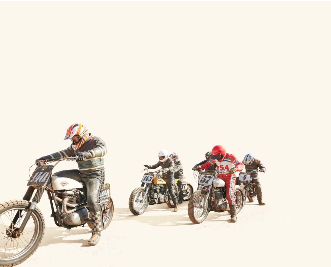 Into the White – studio quality bleached exposure. No distractions, just the flat trackers and the pensive riders waiting for the green light.