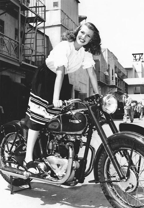 Gilda – actress, dancer and wartime pin-up Rita Hayworth would have been 99 today. 40’s femme fatale she headlined many of the top films of the day. This is such a happy photo of her on a spanking new Triumph Speed Twin.