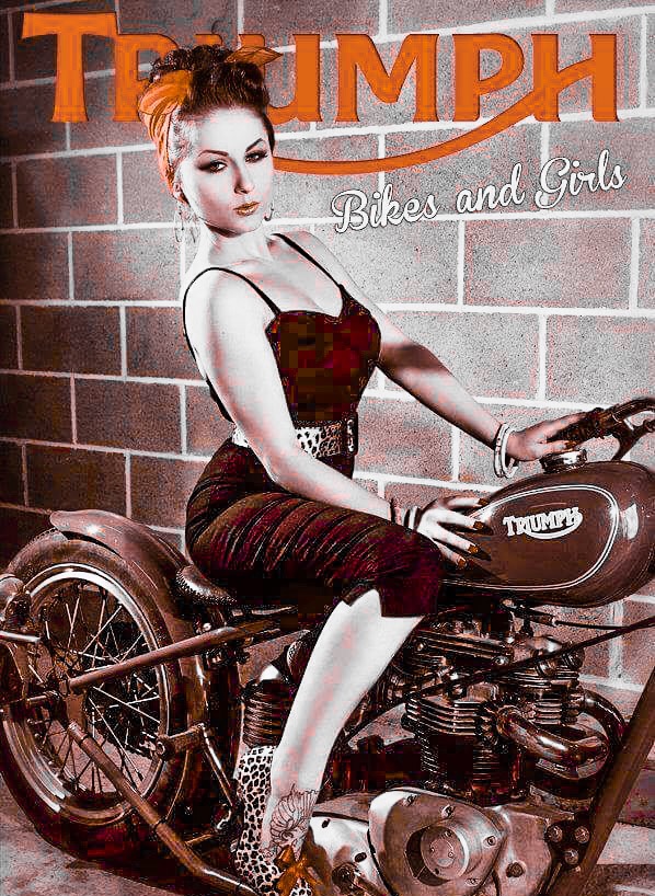 Pout – a doll posing her looks with the elegant complementary lines of a hard-tail bobbed Triumph modeling prop.
