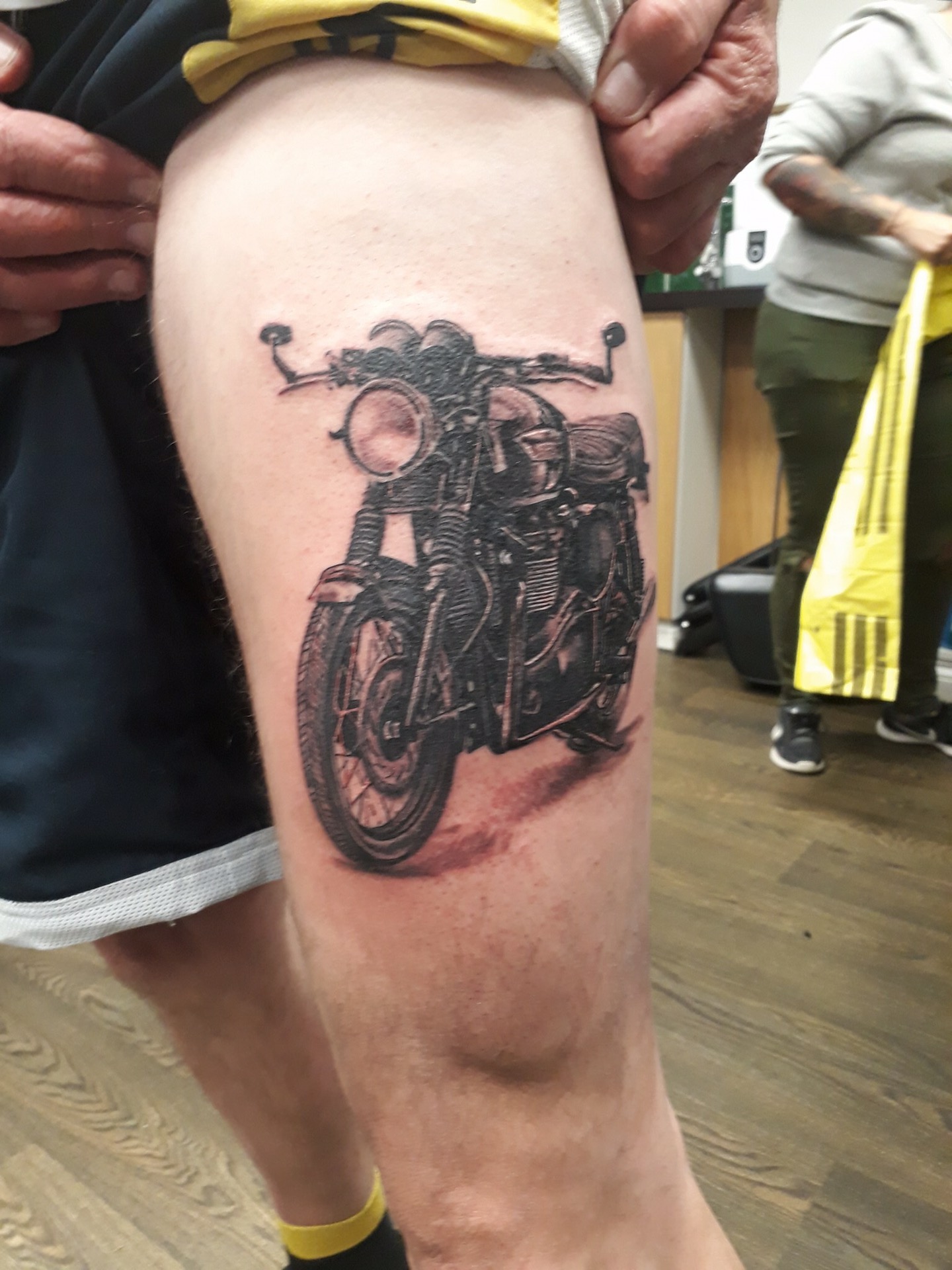 Quad Bike – Tattoo of a Triumph devotee. Inked in detail and wrapped around the thigh.