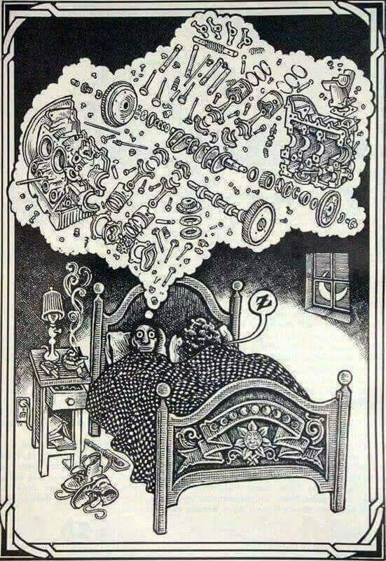 Insomnia Mechanics – a wide-eyed and wakeful Robert Crumb -like character has a fitful nocturne wondering about the engine reassembly. A three dimensional jigsaw that must come to life upon completion. A cup of Horlicks on the bedside table is needed, with a workshop manual on hand, and a cat on the bed to keep you company.