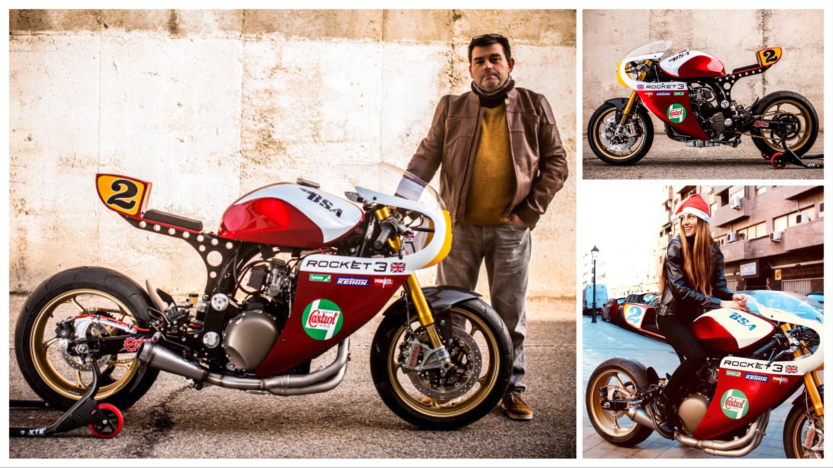 ROCKET 3 – what a beaut this cafe racer build is! Eye-catching with a speed driven poise, and a homage to the BSA Daytona conquering triples of the early seventies ridden by Dick Mann and Don Emde (Gene Romero ran the triple engined Triumph). Builder is the extremely talented Frenchman Pepo Rosell of XTR Pepo using a 2000 Triumph Legend 900 as the starting point. Original 750/3 engine designer Doug Hele and frame guru Rob North would be proud.