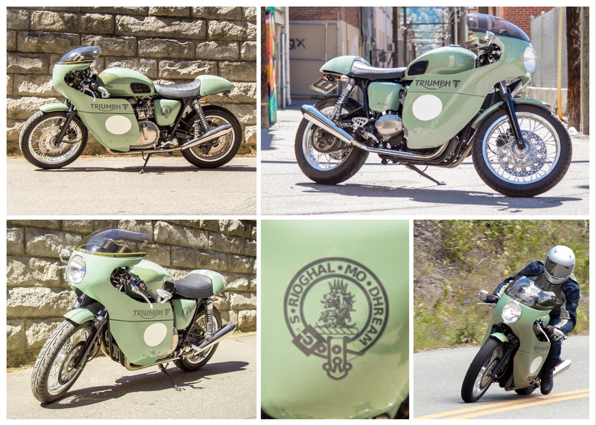 Sage Rage – a wonderfully detailed Thruxton in mint green with a nicely balanced Dunstall fairing. Built by Mike Sadler of Division Motorworks in Canada as directed by owner Patrick McGregor. The side panel is adorned with the clan crest and the motto: Royal is my Race.
