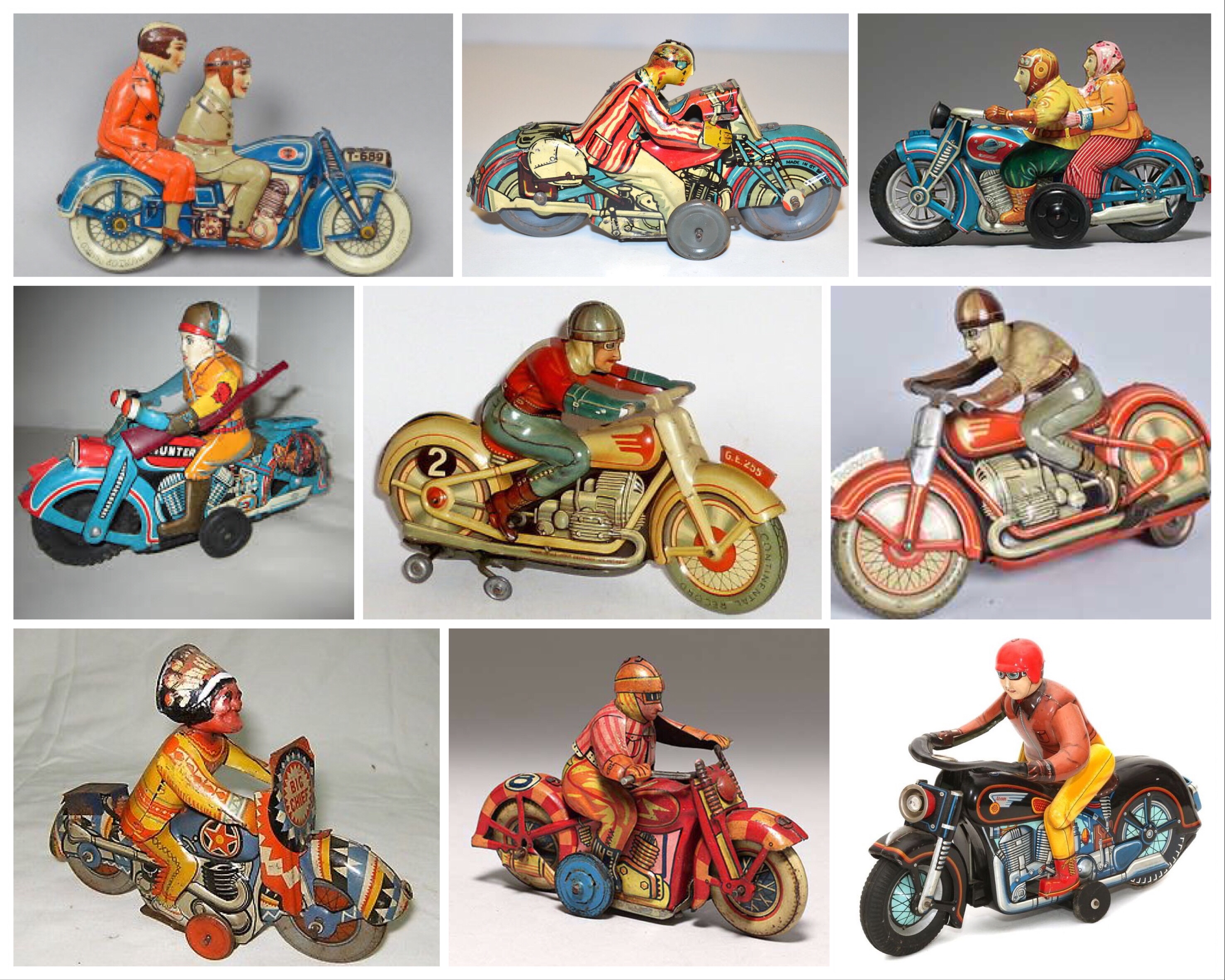 Tinman – clockwork motor wound up with a small key. These brightly colored toys are fun to look at; both the illustrated mechanics as well as the riders clothing. Some original examples can reach prices like a real motorcycle… my favorite is the couple riding smartly on the top right.