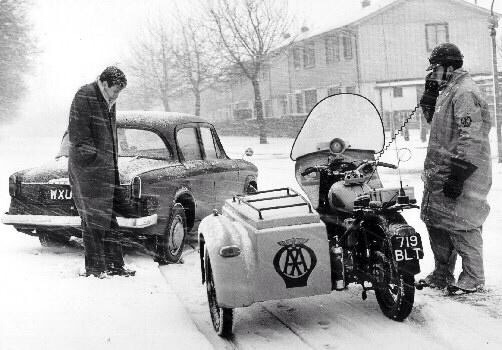Winter is Here. As January draws to a close we’ve had a couple of unseasonably warmer days here in Chicago. Don’t let that fool you! It’s forecast to snow later this week and plunging temperatures are anticipated again. Here’s a classic image of an AA officer coming to the help of a broken-down Hillman Minx.