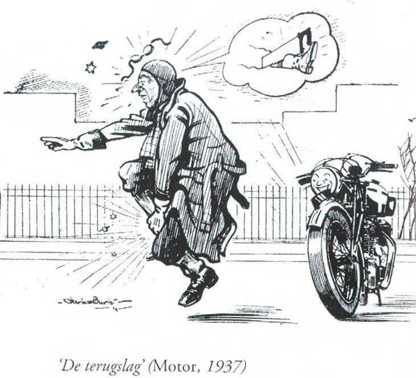 Backfire! One of the unfriendly characteristics of a kickstarting motorcycle is the occasional pre-detonation that flails the lever back into your foot or shin. There aren’t enough curse words in the English language when this happens… Fantastic depiction by the talented pen and ink work of Dutch illustrator Charles Burki “The Recoil!”