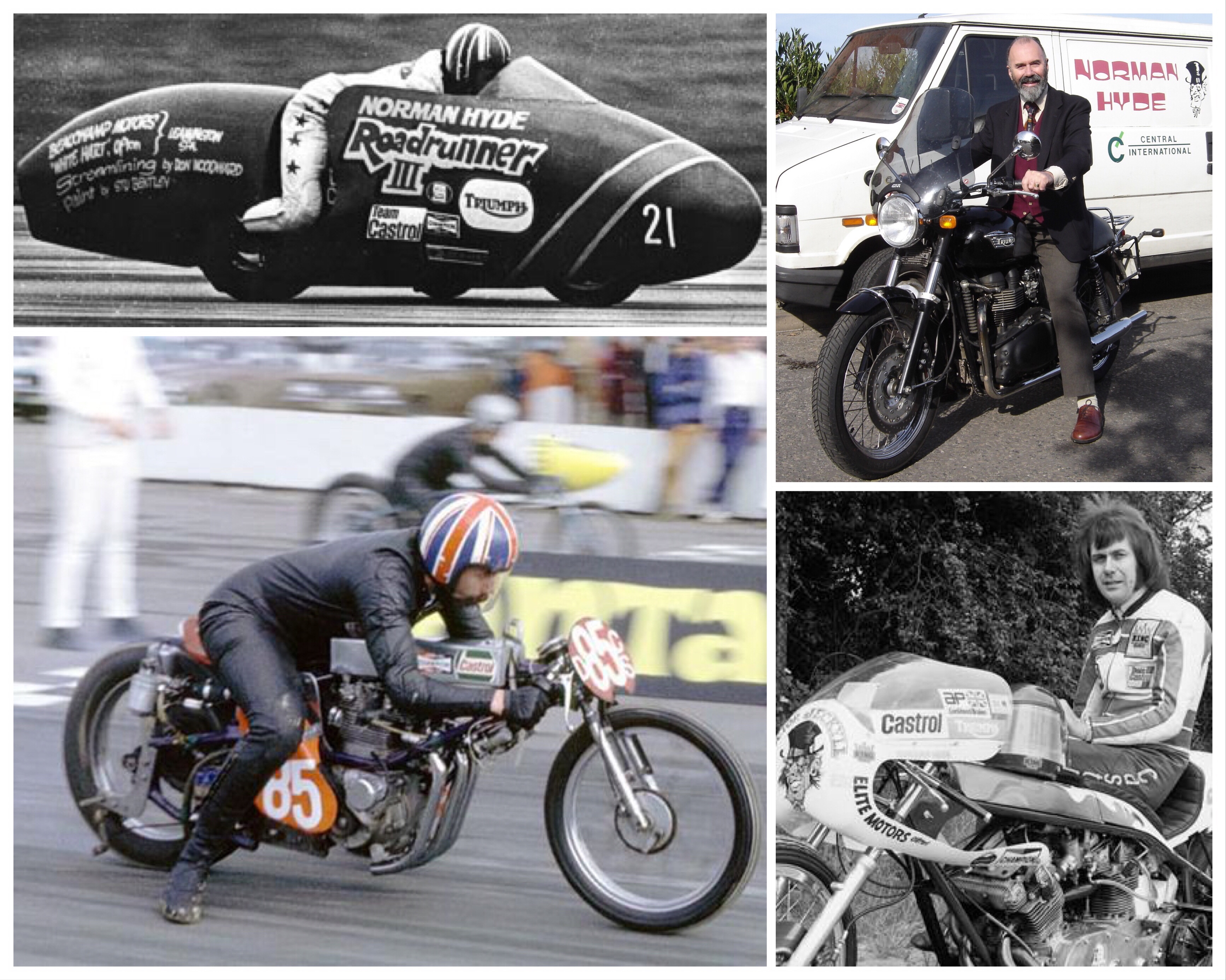 Dr Jekyll – the beast within. Specialist motorcycle performance component guru Norman Hyde has a solid history in making Triumph run quicker and faster. Under the tutelage of Doug Hele at the Triumph Racing Development Department he cut his teeth on making Bonneville’s and Tridents go like the clappers. Records were made on the drag strips with his meticulously engineered machines. Norman looks rather dapper in his weskit & jaiket astride a newer Bonneville for which he’s developed many performance parts.