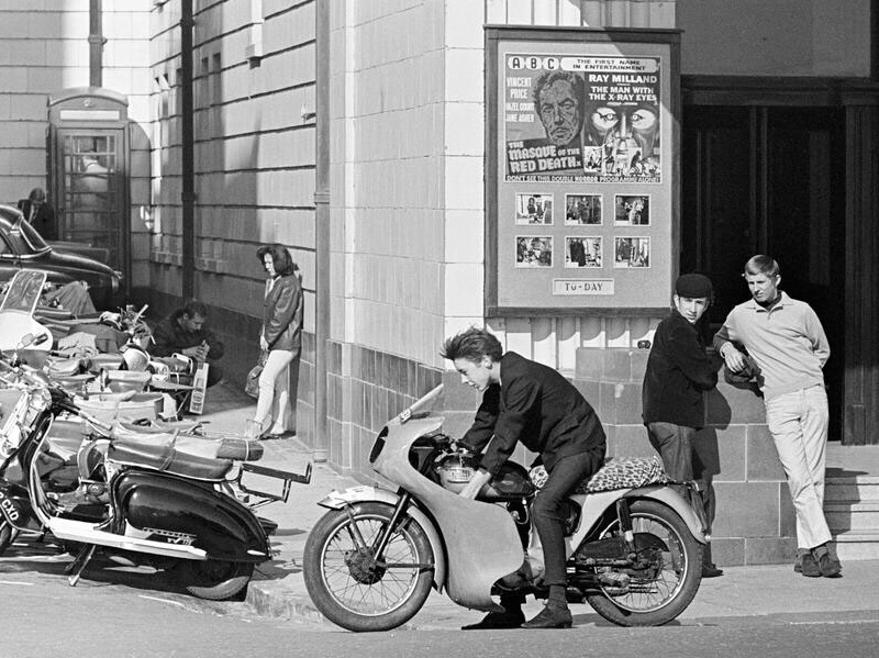Brighton 1964 – if you were there you were either a Mod or a Rocker. The scene to bee seen along the seafront of Kings Road. This smart chap has a leopardskin seat cover on his faired Triumph Cub whilst some other clean-cut youths gaze on. Horror films on show for period entertainment though the daily lifestyle of these two iconic subcultures were heady enough. Great photo though!