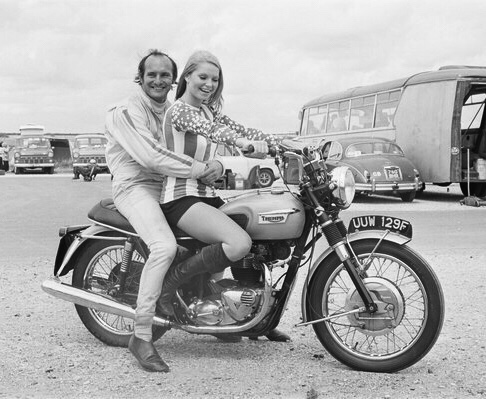 Mike the Bike – born this day in 1940 Mike Hailwood went on to become one of the most naturally talented road racer of all time. As well as a maestro at GP in all sized engines he could also beat the best of ’em at the Isle of Man TT. His 1978 comeback for the Senior TT is the stuff of legend. Mike looks most comfortable as pillion to James Bond Film actress and ’69 Miss World Eva Rueber-Staier on a Triumph motorcycle. photo taken at Thruxton, UK, on 1st August 1971
