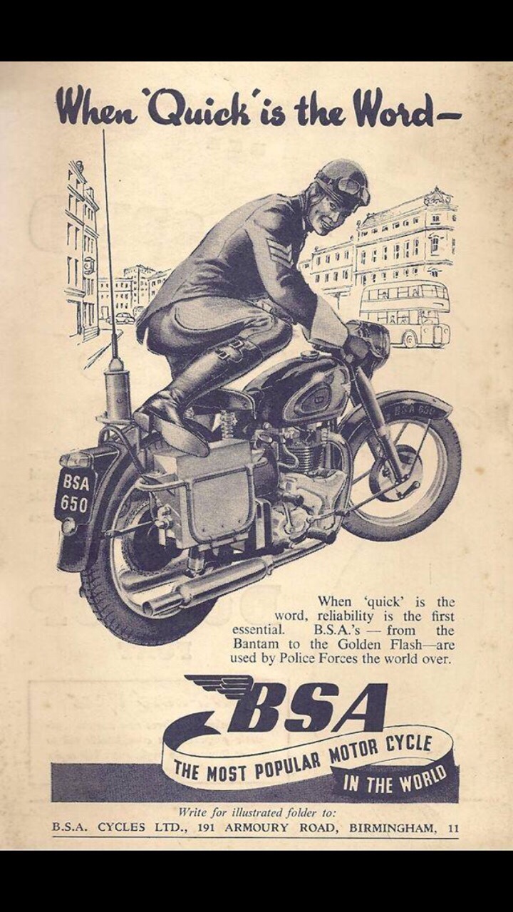 Police Steed – bobby on a Beeza. When British motorcycles reigned supreme the local forces used the best of ’em to get along the road with speed. Nice monochrome ink painting advert with a happy sergeant copper swinging his police boots over an A10 escorting some VIP no doubt.