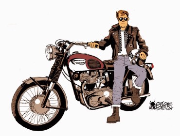 Cartoon – burly and surly character and his ’67 Bonneville illustrated in fine style by Quique Maqueda. Other graphic offerings can be seen on his blog: Magnificent Men Flying Machines.