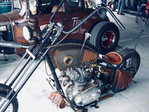 A Full Head of Steam – Fill the boiler, stoke the fires, crank the flywheel, spin the governor. The Age of Steam Power fed the Industrial Revolution the explosion of society that would eventually become modern times. Some inventive folk like to adorn Victorian garb and assume an air of a contemporary age still driven under James Watt’s engines. Steampunk! Here’s a custom Triumph Triple set up as as if it were a 19th Century era Motorcycle.