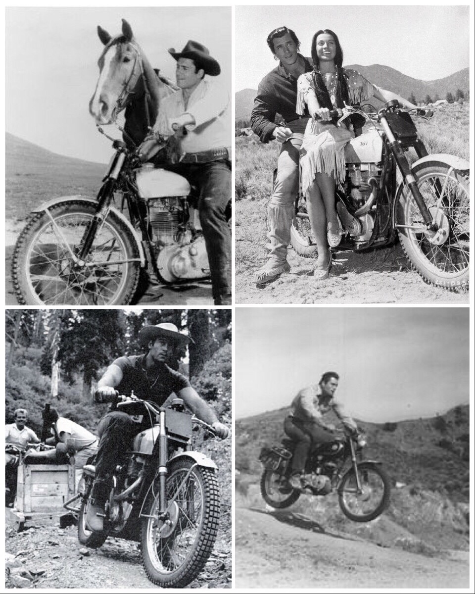 Cheyenne- he was a big dude with mellow baritone voice and perfectly cast as Cheyenne Bodie for 8 seasons back in the late fifties. Clint Walker, who passed away a couple of days ago at the sturdy age of 90. enjoyed riding, either equine or moto. Here he makes his BSA B40 single look like a pony on the trail. That’s Andra Martin who portrayed an Arapaho captive in another Clint Walker movie Yellowstone Kelly, about an Indian tracker.