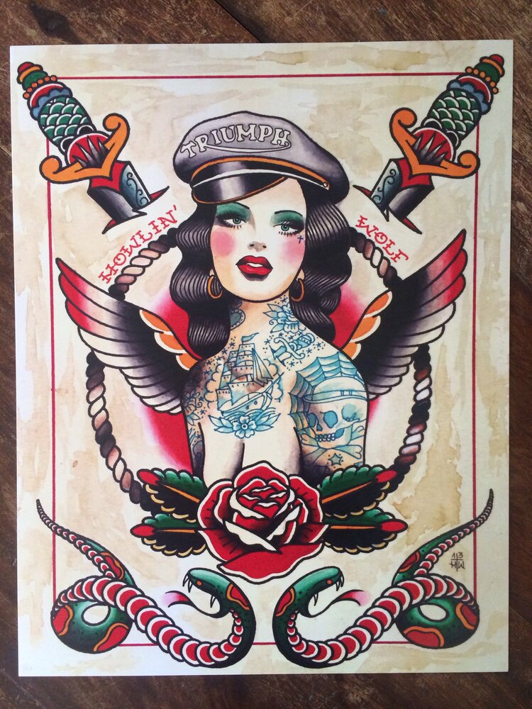 Of Ink & Skin – in the vein of a Sailor Jerry Tattoo this graphic has a rosy cheeked brunette surrounded by classic ink symbolism. Piercing daggers and forkéd tongue serpents represent the Roman god Mercury for transportation or trickery. The red rose promises new hopeful beginnings. Safe travel is borne by the wings of a bird. And Lydia, for she IS the tattooed lady, has the German Kriegsmarine cap emblazoned with the Triumph motorcycle logo for winning effect.