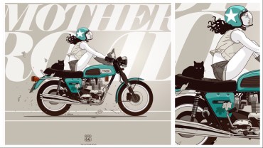 The Mother Road – beautiful crisp graphic art by Antonio Ortega showing a MotoGirl sitting recumbent on her speeding triple. A lucky cat sits contentedly at pillion. All is Good in the World.