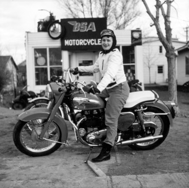 Casper WY – BSA dealership run by Tim Oler was at 1343 S. McKinley St. here his wife Olive rides a smart new A10 Shooting Star around The Oil City on the edge of cowboy country in 1956.