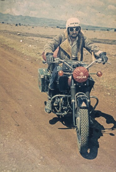 Worldwide Wanderer – Jovian traveler Ted Simon looks quite snazzy in his mod shades as he rides across some dusty trail. This is an original Instagram photo.