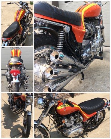 Hurricane – in an attempt to win over a flagging US customer Triumph and BSA employed industrial designer Craig Vetter to create bodywork for the new and fast triple that would appeal to the American market. Though a BSA Rocket Three at heart, by the time the X75 was released it was emblazoned with a Triumph badge. The deep orange with yellow swoosh are inspired with an hourglass shape that provides a sexy line to this muscle of a motorbike. Triple stacked silencers on the timing size are keenly futuristic. This example was built by Ed Zender for a customer. He says it runs well with a powerful and tight power unit. In the sun it’s a sublime example of a special British motorcycle.