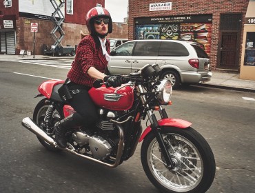 Pucker Up – this lass gives us a sly kiss for the coming weekend as she wheels along some New York City Borough. Cherry red Triumph Thruxton ensures coolness fit for her shades.
