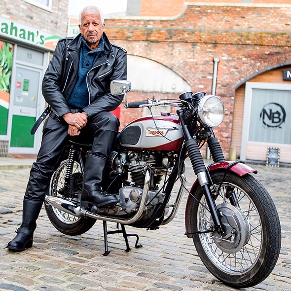 Corrie Bonnie – leather clad actor and 1970’s children’s television presenter Derek Griffith is looking calm and collected perched aside this classic Triumph. The setting is Coronation Street, location of the long, long running kitchen-sink soap opera.