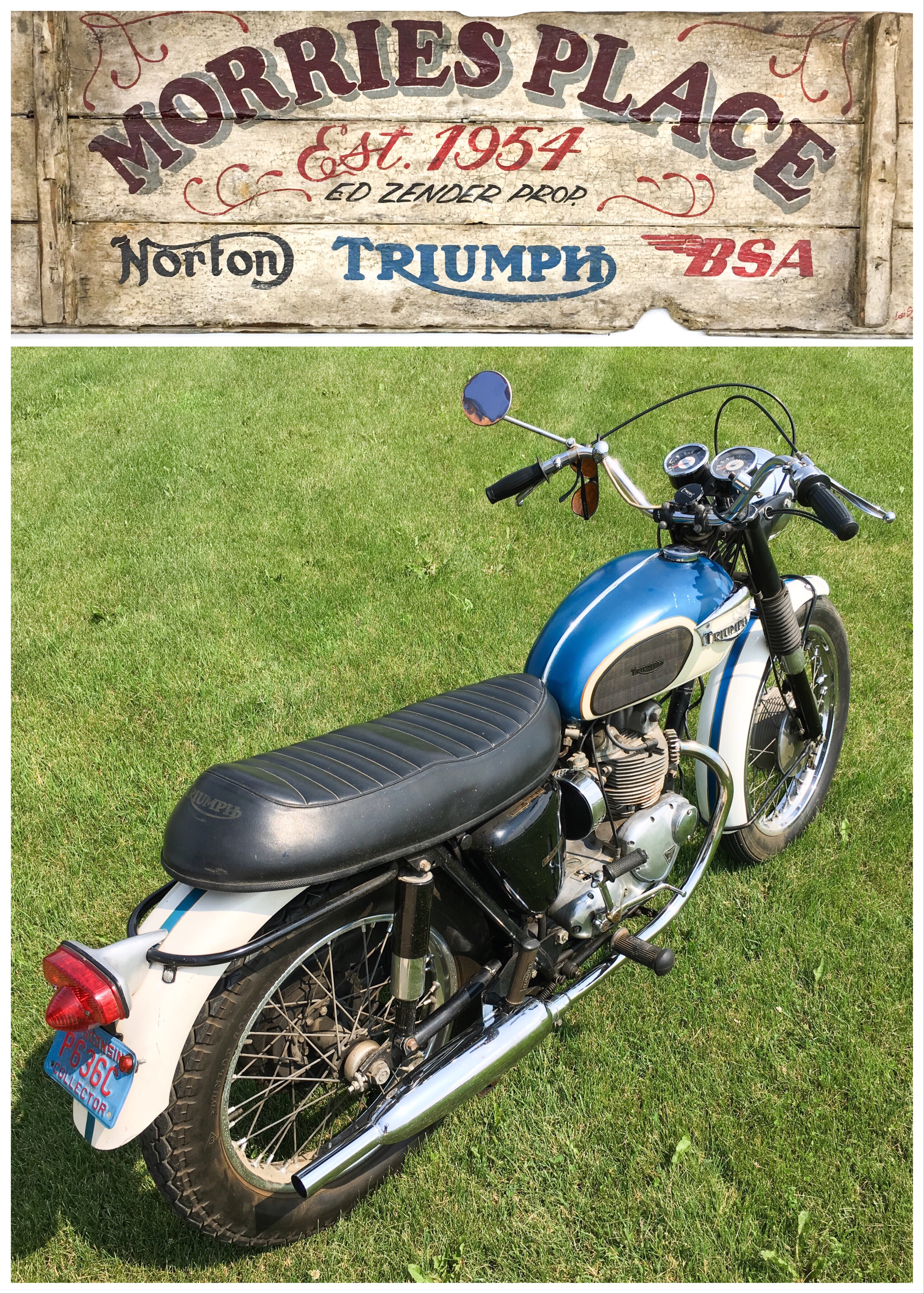 Daytona – little brother of the Bonneville. Though only 500cc’s against the 650 T120 it still managed to maintain an enviable racing career. This original example is owned by Ed Zender; he’d just pulled it from storage the day before. I’m including the old shop sign from the earlier location up on Route 173 near Richmond IL.