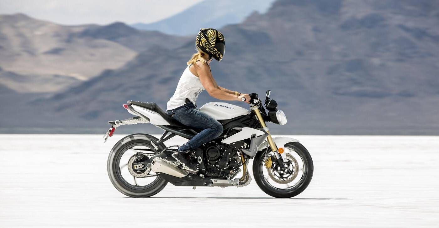 Salt ‘n’ Pepper – Bonneville is legendary for the vast stretches of flatness allowing two and four wheeled vehicles to be tested against the demon of speed. Here is Jessica Giesen, who is head of the North American Marketing & Public Relations departments at Triumph Motorcycles, taking a white Speed Triple along the paper flat plane. Without a jacket she won’t be winding up the throttle across the sandpaper rough surface. But the white on white on white looks cool.