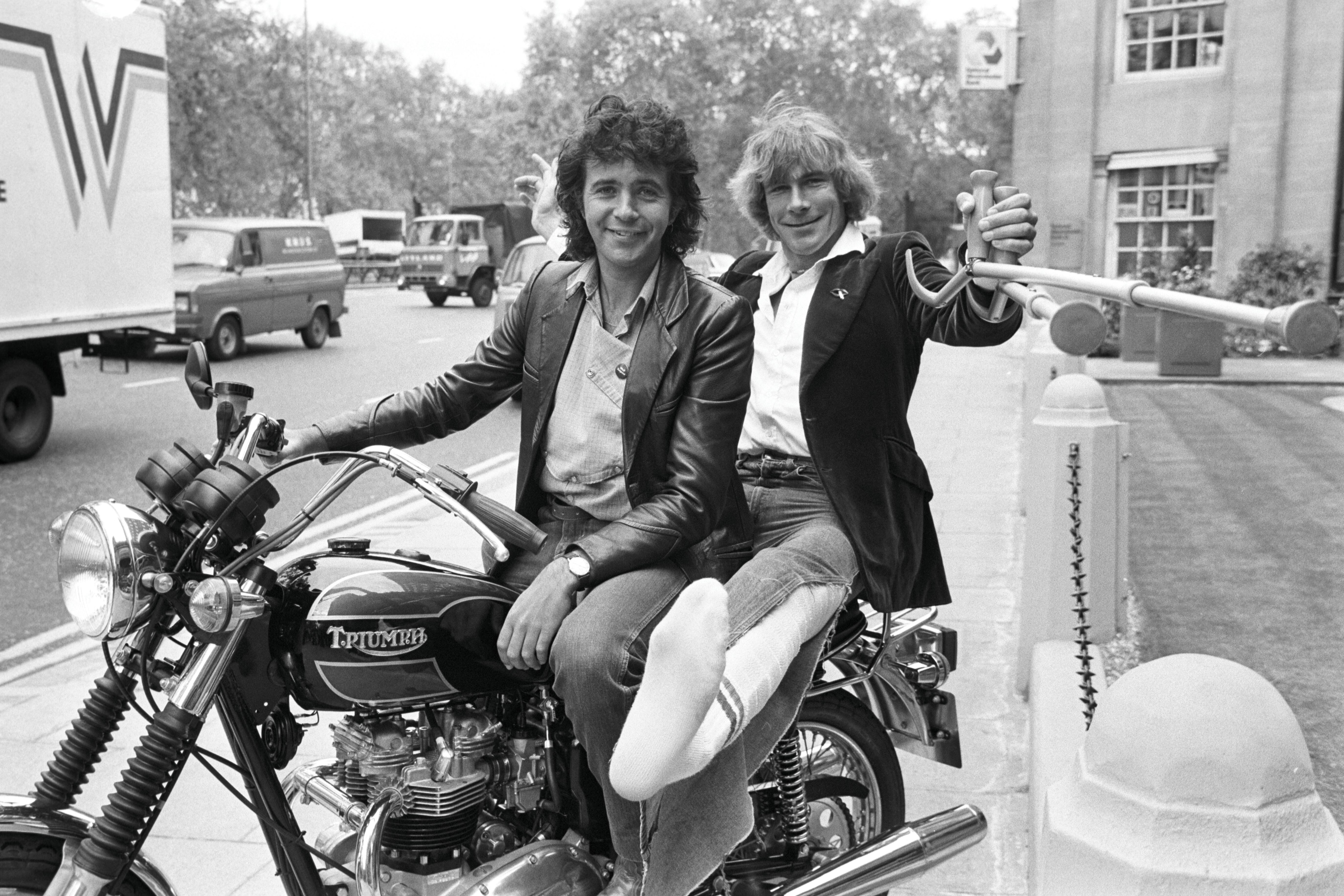 Break a Leg! Period post seventies shenanigans as singer David Essex and the late great racing driver James Hunt lad it up on a Triumph T-140. Hunt broke his leg skiing thwarting a possible comeback in 80′ with McLaren.